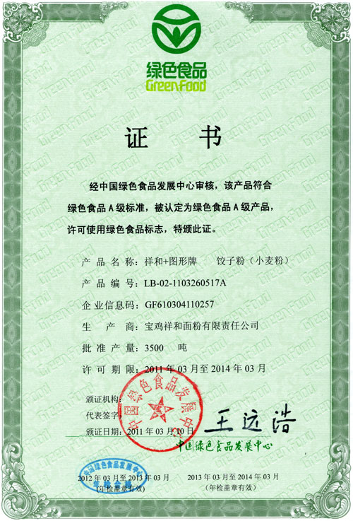 饺子粉(小麦粉)绿色食品证书